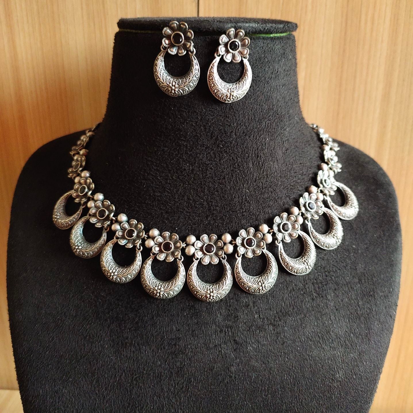 Bring vintage charm to your style with this 925 silver-plated oxidised necklace set from Sarichka Fashion, featuring an artistic half-moon design adorned with intricate floral patterns. Finished with a classic oxidised silver polish, this statement piece is both bold and elegant.
