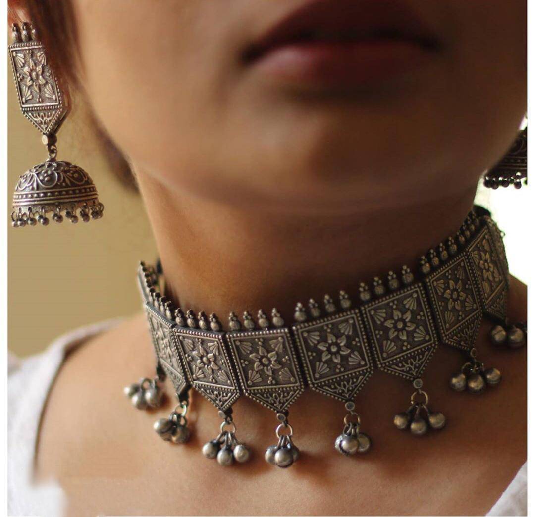 Elevate your festive style with this antique silver look-alike choker set from Sarichka Fashion, made to complement your Navratri and Garba outfits. The beautifully detailed choker comes in a rich oxidised silver finish with ethnic engravings that radiate vintage charm. Paired with bold traditional jhumka earrings, this set is a perfect statement for weddings, festivals, or special occasions. Its timeless design also makes it a great gifting option for loved ones.