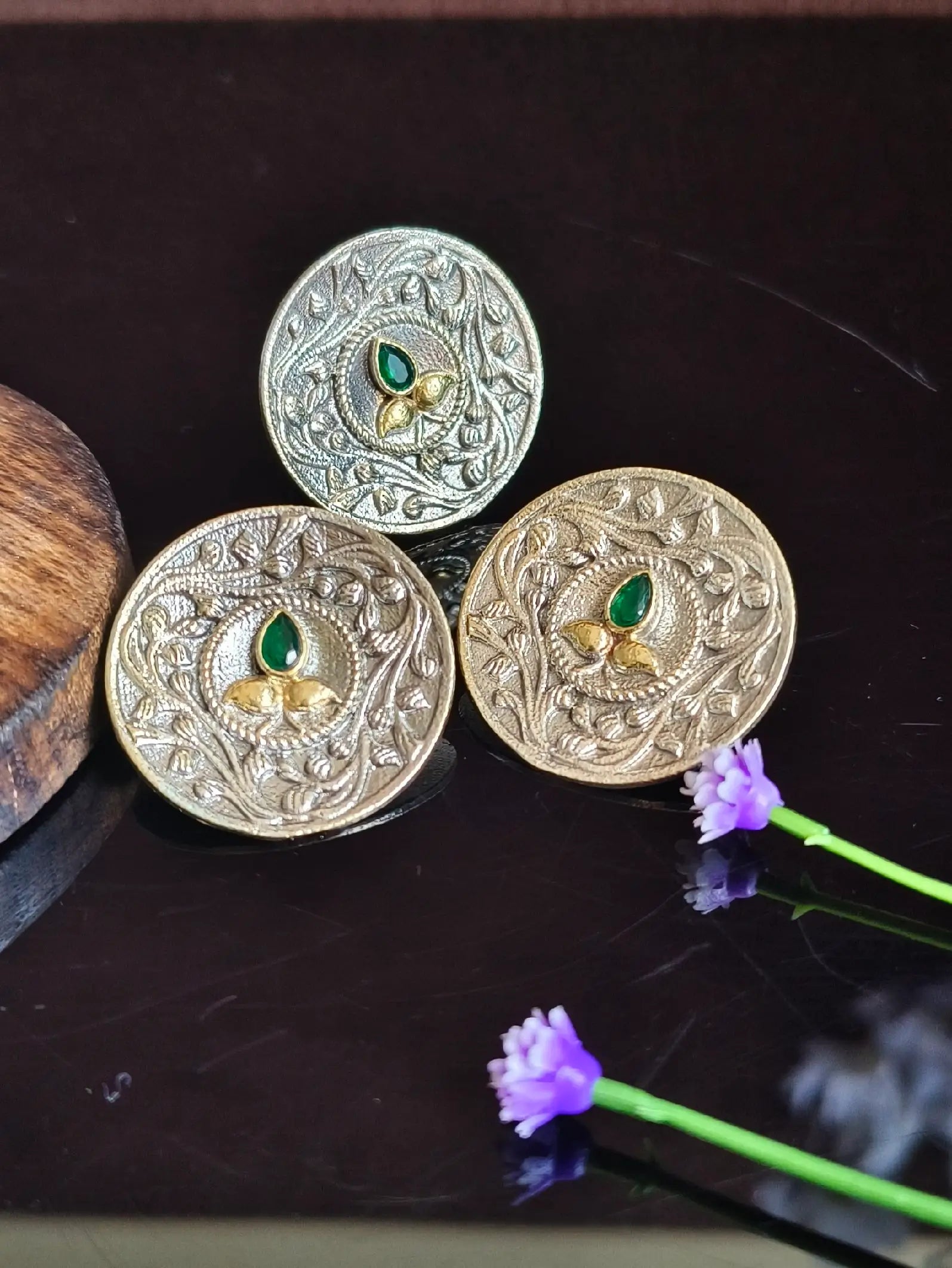Find the appeal of ethnic style with these Coin Oxidized Studs with Rings that are a wonderful blend of modern design and traditional fashion. Made from high-end brass and finished with silver plating These earrings convey elegant elegance. They are adorned with intricate tribal patterns, making these earrings ideal for informal and formal occasions. They are an eye-catching accessory to match any outfit.