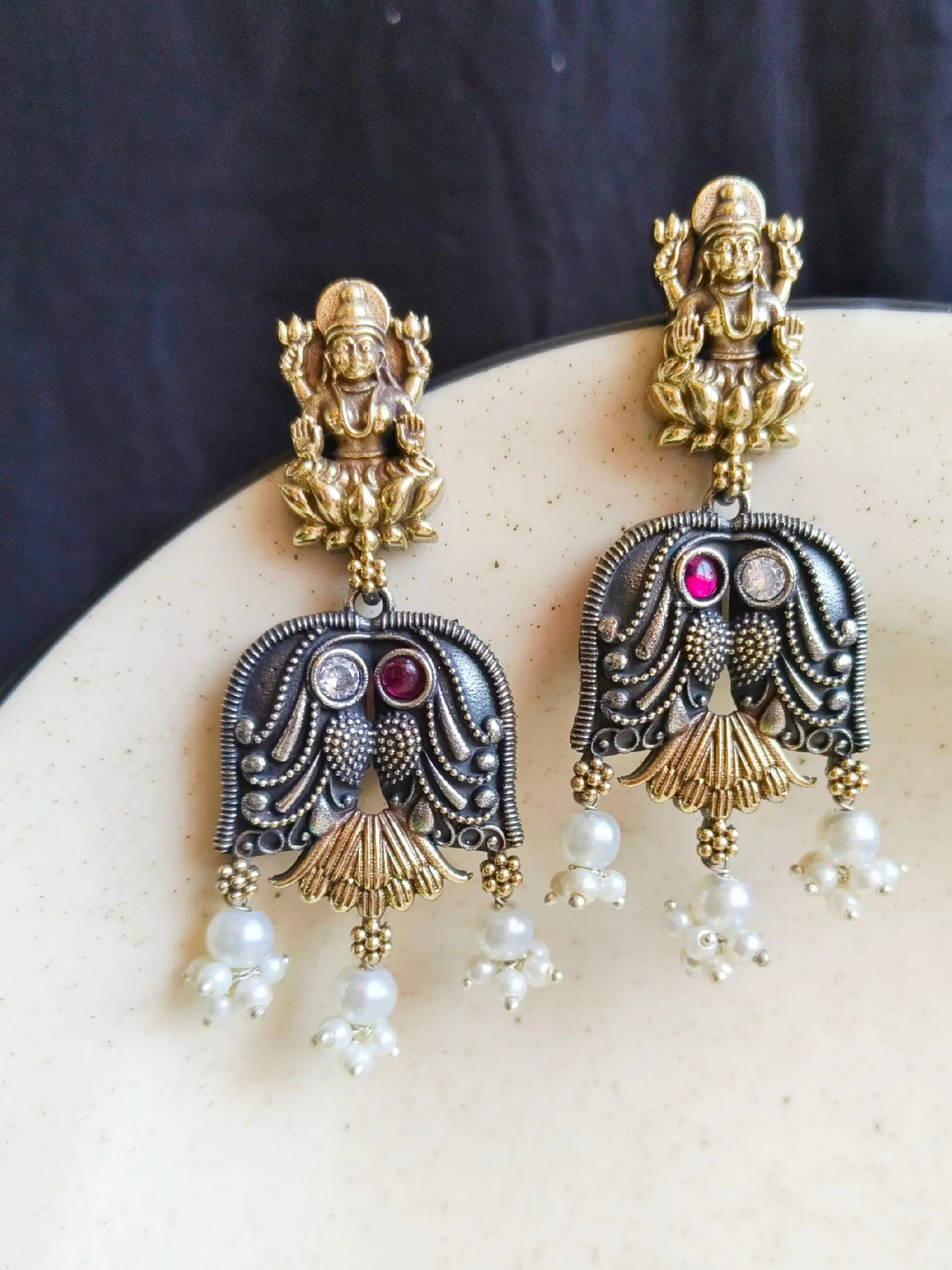 Enhance your jewelry collection with these antique dual-tone oxidized goddess dangler earrings, a perfect blend of tradition and elegance.