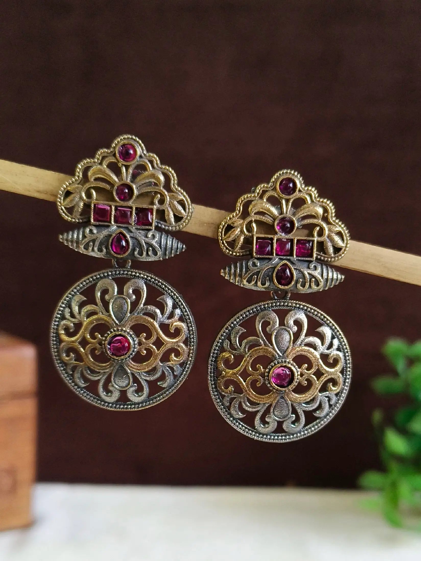 Step into elegance with these Dual Tone Oxidised Gemstone Dangler Earrings from Sarichka. Crafted in a striking dual-tone finish of silver and golden polish, these earrings feature a statement gemstone centerpiece that enhances their ethnic charm. The dangling silhouette adds movement and grace, making them ideal for parties, weddings, festive occasions, or even casual chic styling. Lightweight yet bold, they bring the perfect balance of tradition and modern flair. These earrings also make a thoughtful gift option for loved ones.
