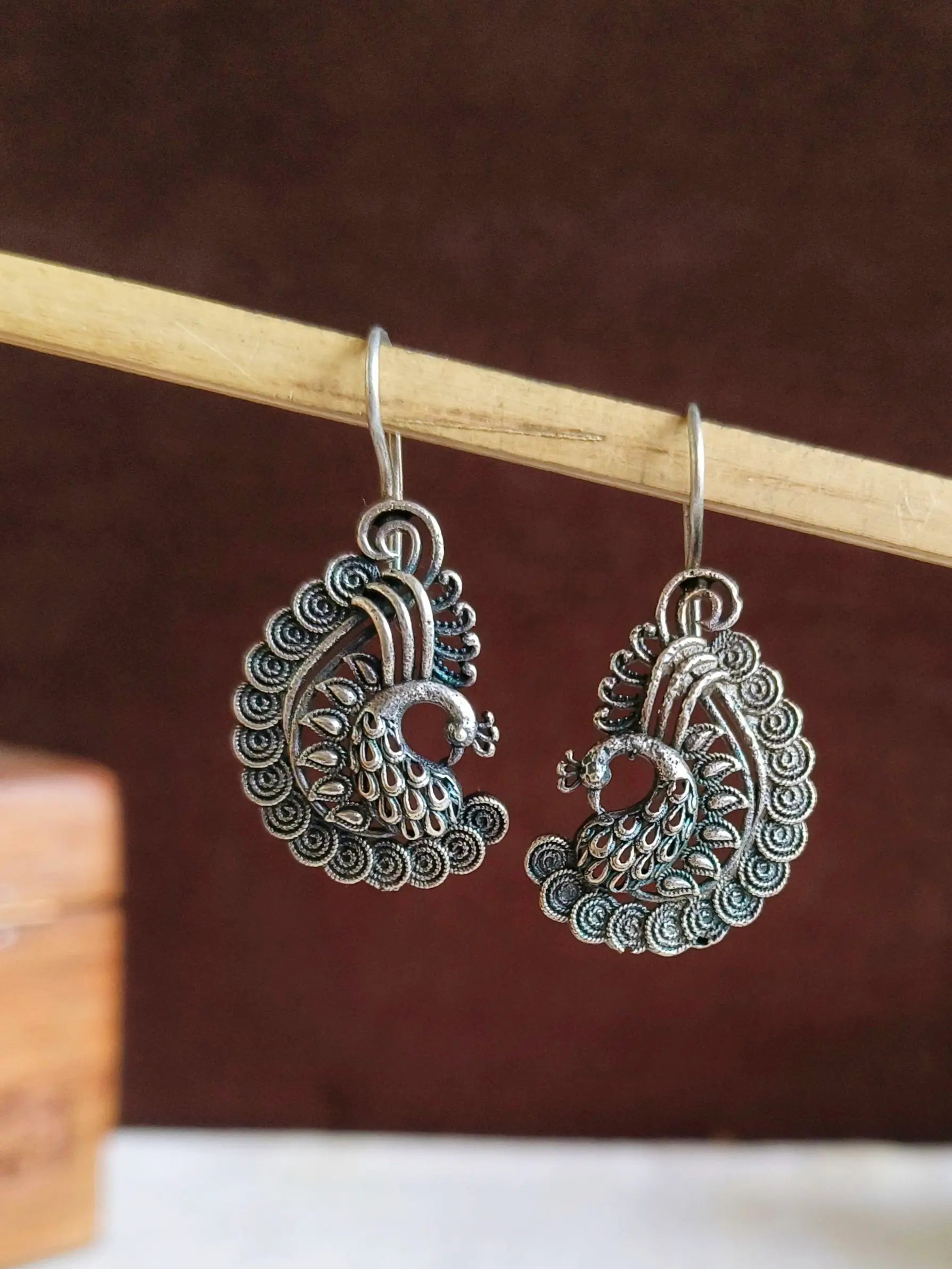 Elevate your style with these Oxidised Peacock Brass Hook Earrings from Sarichka, a perfect blend of traditional artistry and modern charm. Crafted from premium brass with high-quality oxidised silver polish, these earrings feature a beautifully detailed peacock motif that adds elegance to any look. Lightweight, skin-friendly, and comfortable, they are suitable for long wear without irritation. Ideal for weddings, festive occasions, casual outings, or daily styling, they also make a thoughtful gift for loved ones. Pair them seamlessly with sarees, kurtis, lehengas, or even fusion wear for a striking appearance.