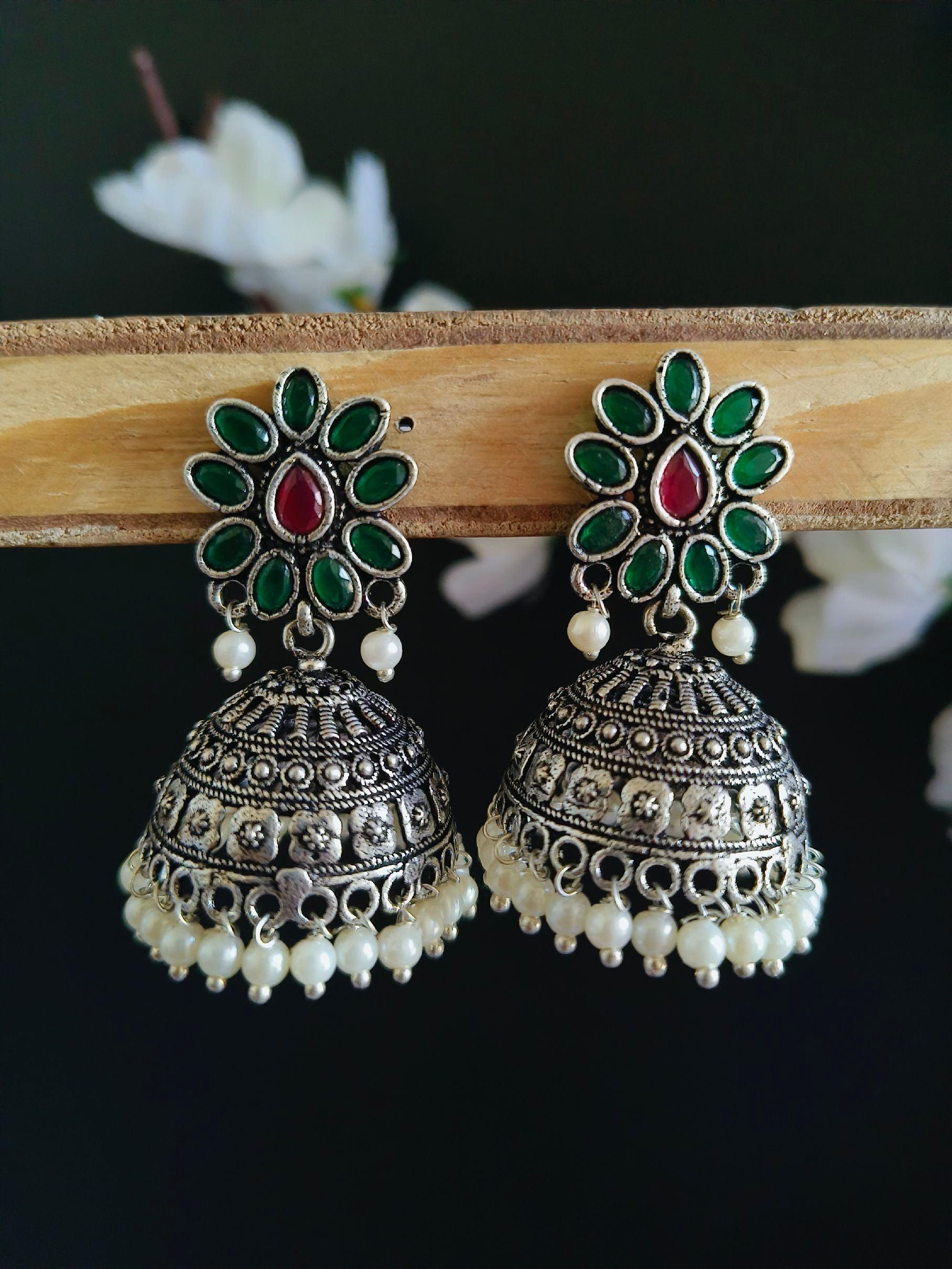 These stunning oxidised pearl & stone jhumka earrings are the perfect blend of tradition and elegance. The intricate oxidised finish brings out a vintage charm, while the pearls and stones add a refined touch. These earrings are ideal for weddings, festivals, and special occasions, making them a great addition to your jewelry collection. They also make an exceptional gift for someone who loves unique, statement pieces. Style them with your favorite traditional or fusion outfits to create a head-turning ensemble. Available now at Sarichka Fashion for all your jewelry needs.