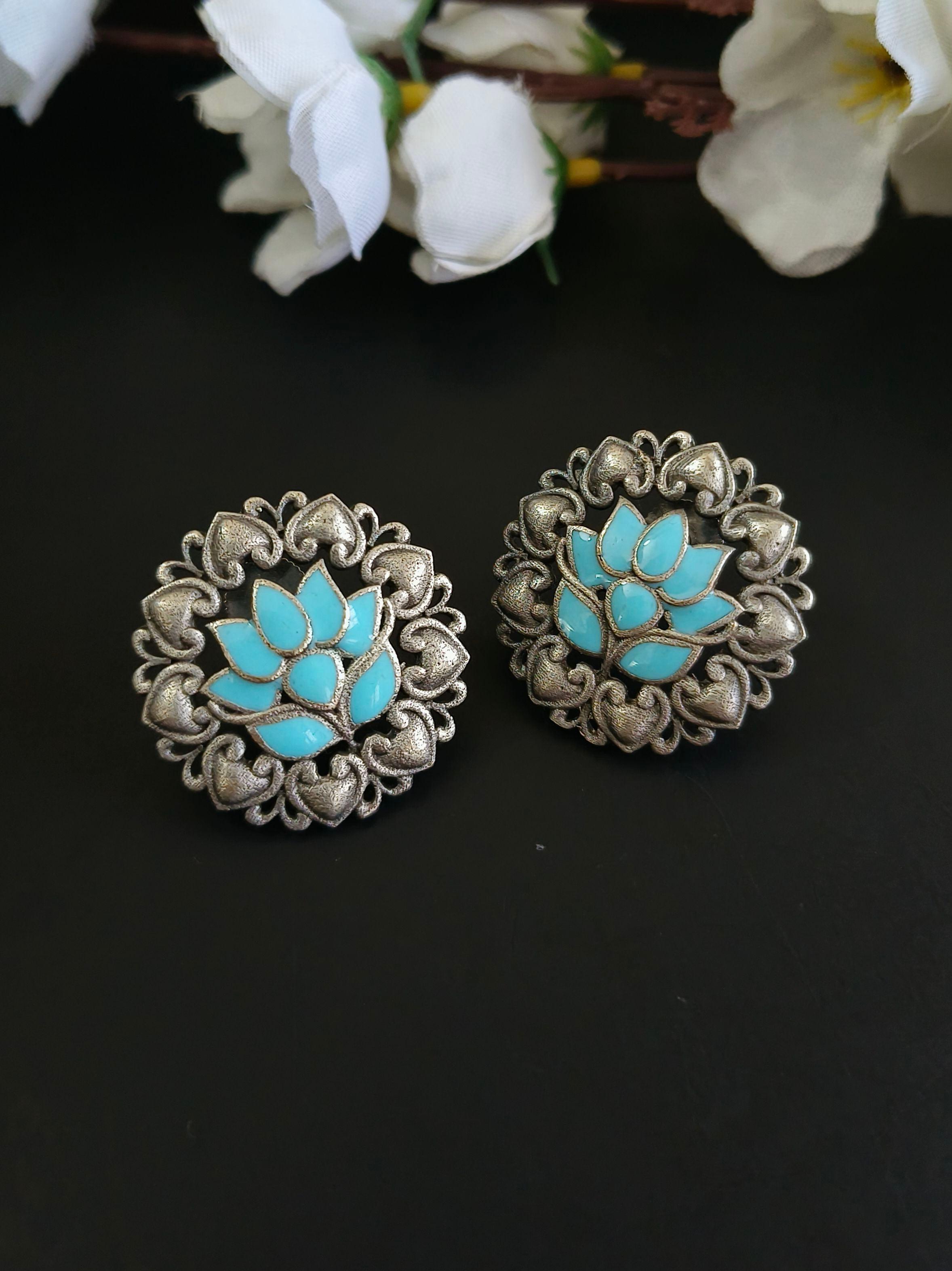 Oxidised Premium Silver Plated Enamel Meenakari Stud earrings from Sarichka speak for themselves and are an essential piece of any woman's jewellery collection this season. Wear this silver pair with any formal or ethnic attire for a perfect look.