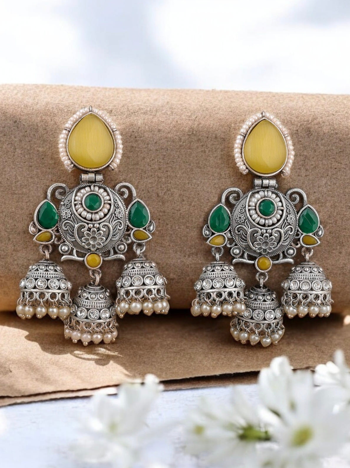 Why You'll Love It: Every detail of this oxidized jhumka speaks of tradition, beauty, and timeless elegance. With its intricate stonework and radiant pearls, this piece will transport you to a world where every occasion is cherished. Perfect for creating unforgettable memories, whether it’s your wedding day or a special celebration. Embrace the art of gifting with something truly meaningful, a piece that will never fade in style or sentiment.