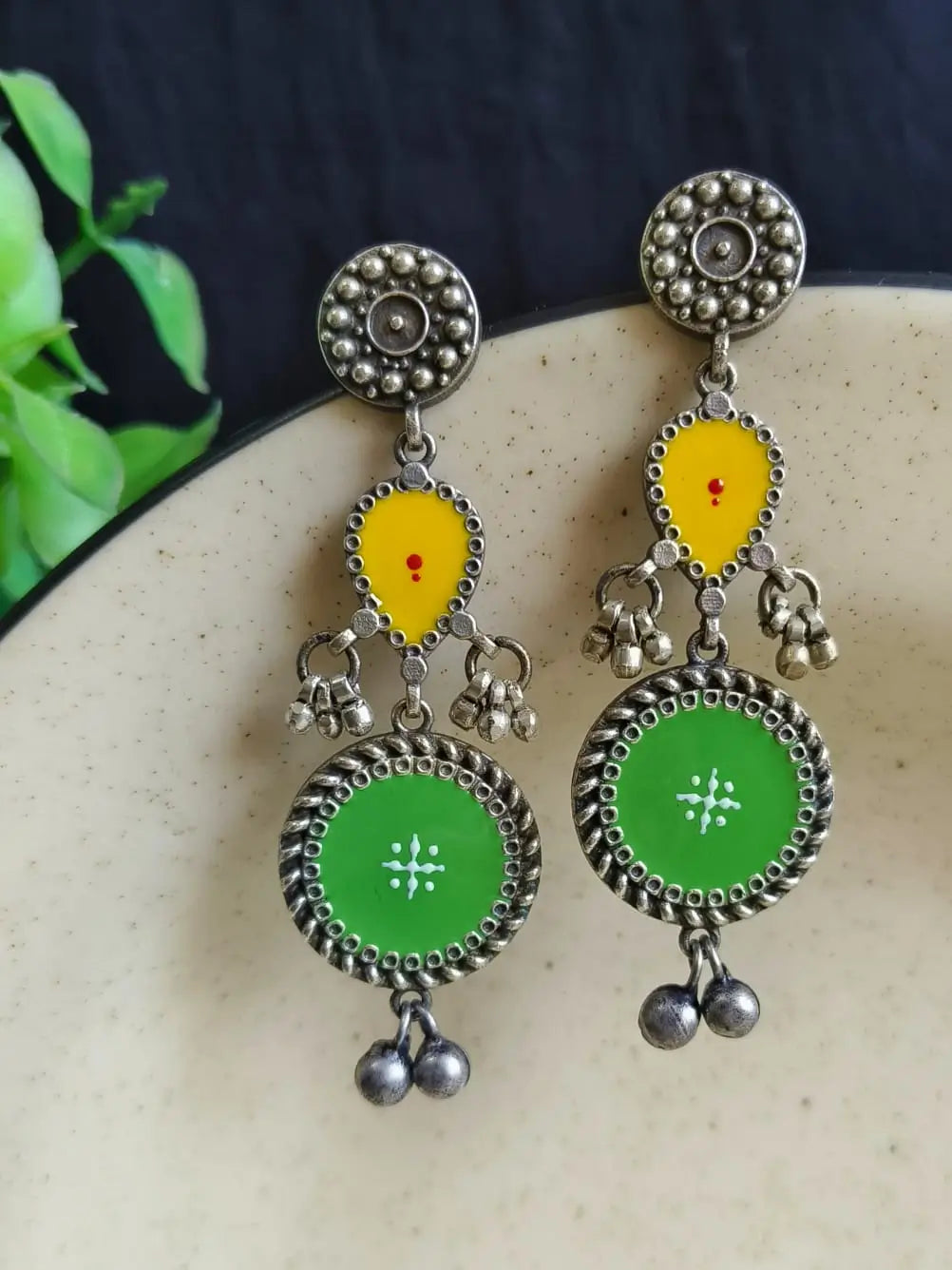 Elevate your look with these stunning Silver Polish Hand-Painted Meenakari Dangler Earrings from Sarichka. Designed with intricate artistry, these earrings blend tradition with modern elegance.