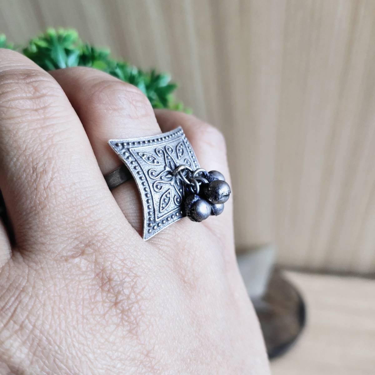 Add a touch of boho charm to your accessory game with Sarichka Fashion’s Silver Look-Alike Square Ghungroo Ring. This statement ring features a bold square top with tiny metallic ghungroos that create a playful, ethnic vibe. Finished in a silver polish, it’s both stylish and versatile — perfect for everything from festive wear to daily casuals. Its adjustable band ensures a snug fit for all.