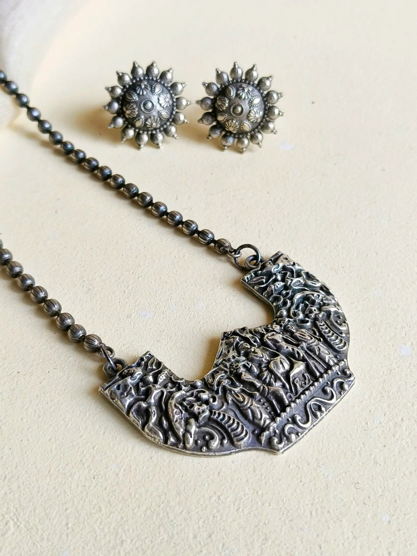 Add a touch of spiritual elegance to your festive wardrobe with this silver look-alike chain pendant set. Perfect for Navratri celebrations, it’s a versatile addition to any jewelry collection!